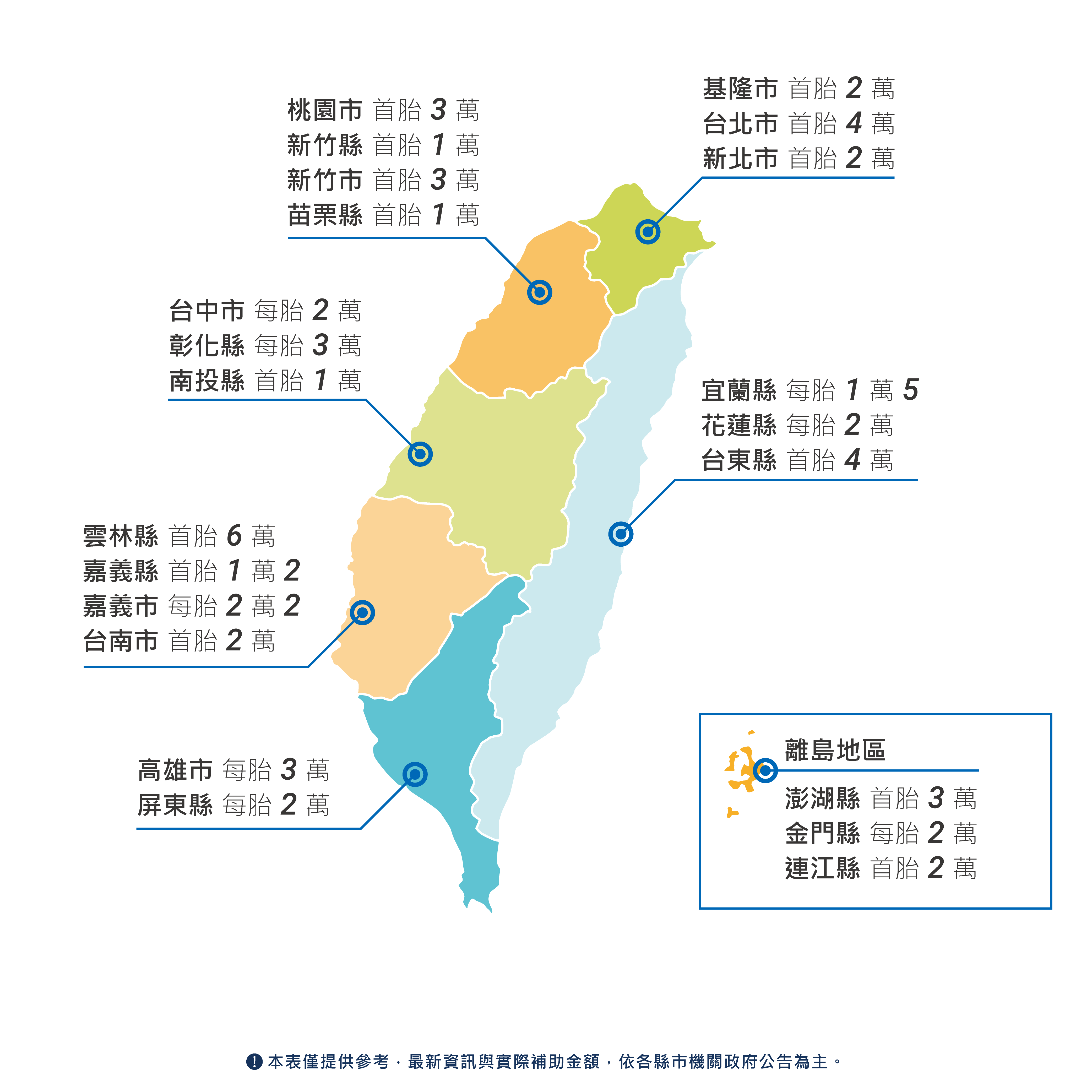 連江縣 | 2 萬 | 第2胎5萬,第3胎(含)以上8萬 |