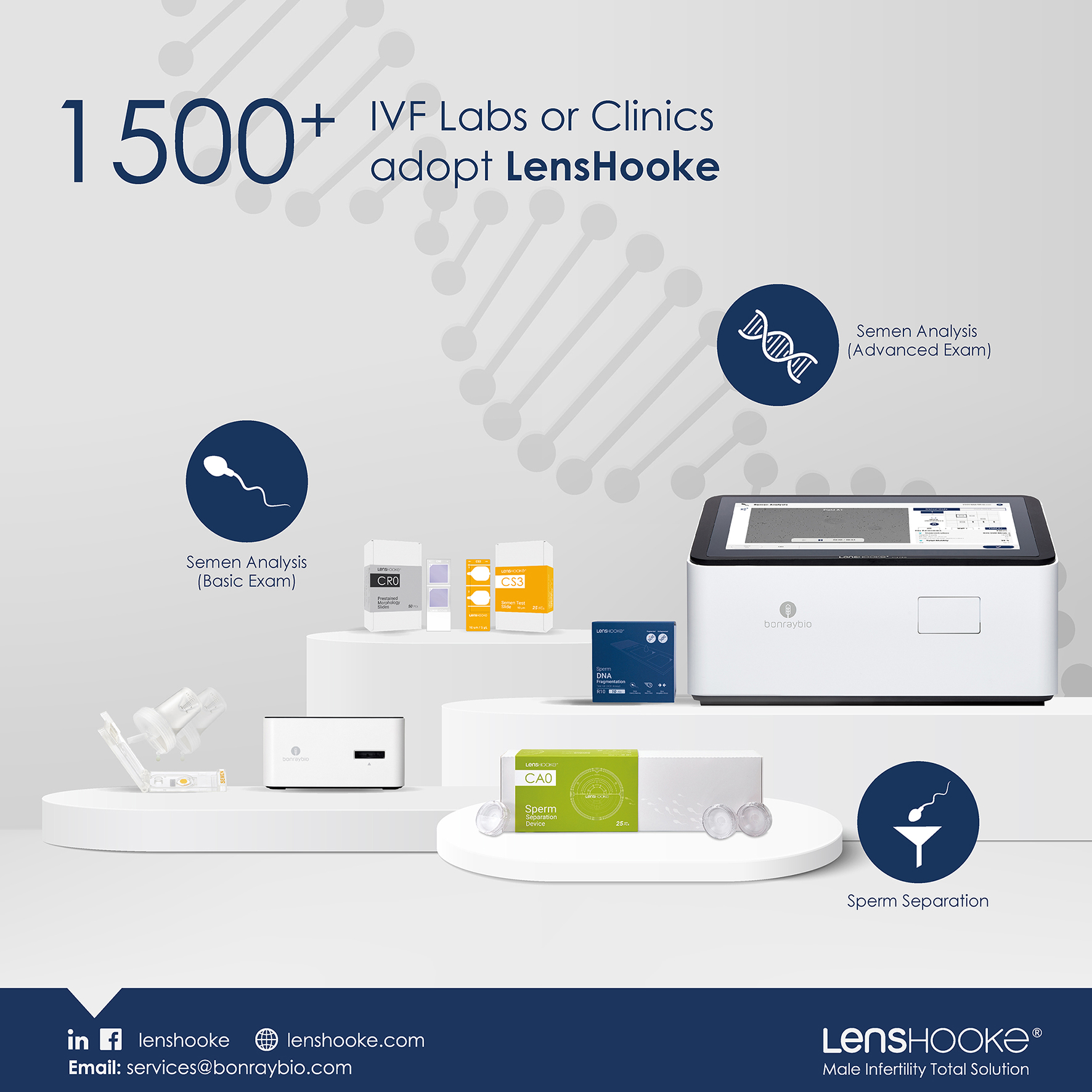 Male infertility has become a very serious issue and be more attention. Lenshooke provides total solution from semen analysis to Sperm DNA fragmentation and sper separation device.