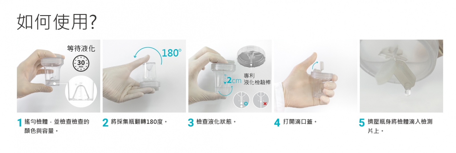 - 請確認液化後再進行檢驗(通常為射精後30分鐘,如果30分鐘後沒有液化,射精後60分鐘後再觀察一次。)